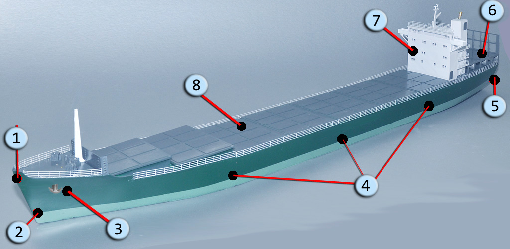 1 - Prova 2 - Carena 3 - Ancora 4 - Babord (Partea stanga) Tribord (Partea dreapta) 5 - Elice 6 - Pupa 7 - Castel Central (Puntea de comanda) 8 - Punte |